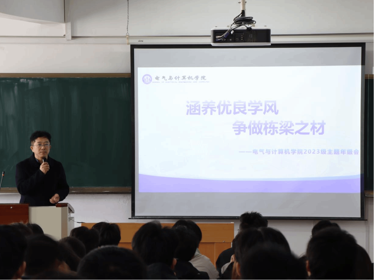 2025年4月14日,电气与计算机学院在土木教学馆D209开展“涵养优良学风,争做栋梁之才”2023级学风建设年级会,由副院长魏立明出席讲话、2023级辅导员孙鹏主持。会议围绕“学业规划”“学风建设”展开,魏立明结合报考国家电网、考研等热点,强调提前规划、依兴趣与目标选择、厚积薄发并以专业主干课为重点;孙鹏讲解学风建设“五个注重”,倡导弘扬“博学笃思、勤勉致知”学风,鼓励从被动学转为主动学、参加学术竞赛提升综合能力。此次会议为学生明确方向与行动路径,学院将继续深化学风建设,提升人才培养质量。